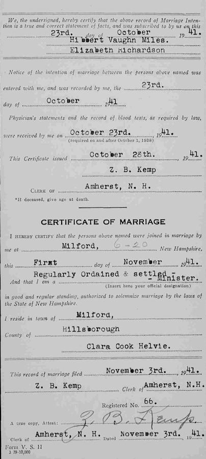 Birth Born on July 21, 1916 in Amherst, Hillsborough Co., NH Death Died on December 29, 2008 in Nashua, Hillsborough Co., NH Buried in Meadow View Cemetery in Amherst, Hillsborough Co., NH Marriages MILES, Hibbert Vaughn Married on November 01, 1941 in Milford, Hillsborough Co., NH Children MILES, Brenda Elizabeth: August 09, 1942 MILES, Joanne: April 07, 1944 MILES, Mary Lu: April 06, 1950 - January 28, 2000 Notes Occupation: Secretary Sources New Hampshire Cemeteries: Meadow View Cemetery Amherst,NH 721 Hilltop Block Images Elizabeth (Richardson) Miles Hibbert Miles MarriageA Hibbert Miles Marriage