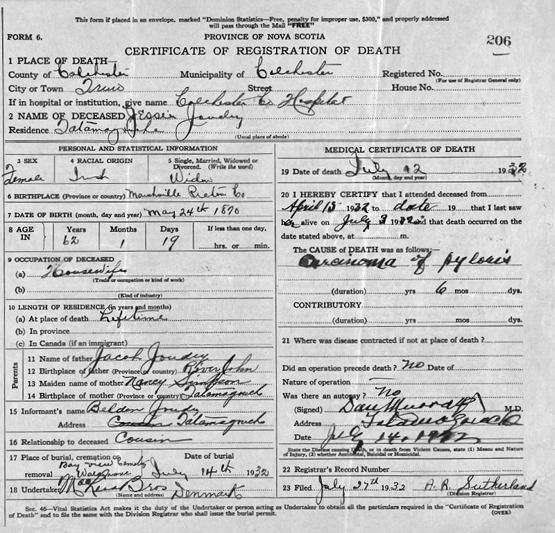 Parents Father: JOUDRIE, Jacob Mother: SIMPSON, Nancy Birth Born on September 19, 1870 in Marshville, Pictou Co., NS Death Died on July 12, 1932 in Truro, Colchester Co., NS Buried in Bayview Cemetery in Waldegrave, Colchester Co., NS Marriages JOUDRIE, Alexander Married on April 07, 1898 in River John, Pictou Co., NS Children JOUDRIE, Amos: September 26, 1898 - January 25, 1933 JOUDRIE, Margaret E.: January 18, 1900 - April 15, 1919 JOUDRIE, Lillian: November 30, 1905 - May 06, 1924 JOUDRIE, Nancy Mae: February 26, 1907 Notes Death: Carcinoma Sources Nova Scotia Deaths: Book 157 Pg. 206 Images Jessie (Joudrie) Joudrie Death Alexander Joudrie Marriage