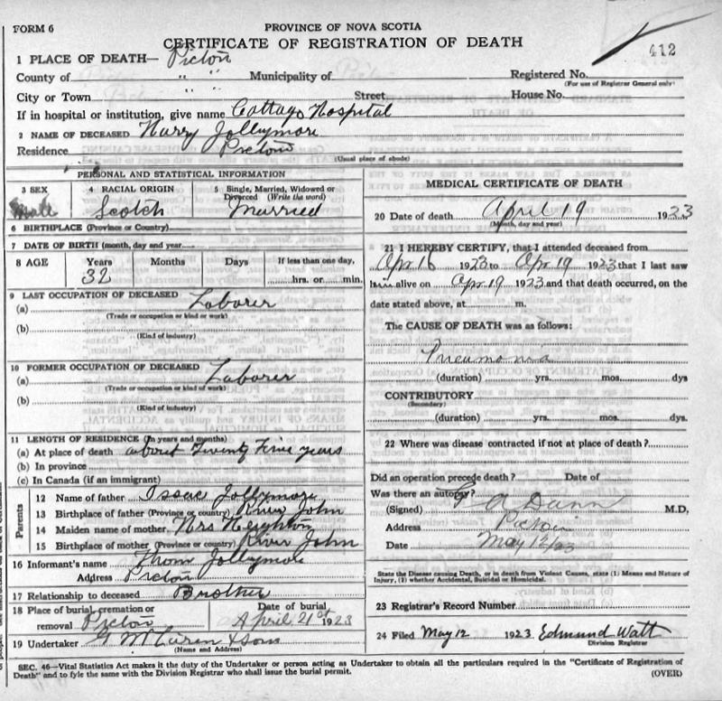 Parents Father: JOLLYMORE, Isaac Mother: HEIGHTON, Ellen Birth Born on August 02, 1885 in River John, Pictou Co., NS Death Died on April 19, 1923 in Pictou, Pictou Co., NS Buried in Pictou, Pictou Co., NS Marriages JOUDRIE, Clara Jane Married on March 16, 1914 in Pictou, Pictou Co., NS Children JOLLYMORE, Pearl Agnes: May 30, 1908 - June 28, 1957 JOLLYMORE, Harriet Kathleen: December 03, 1913 JOLLYMORE, Thomas: 1917 JOLLYMORE, Harry Cecil: April 29, 1920 - July 23, 1944 Notes Occupation: Shipping Clerk/ Canmaker Canning Factory Death: Pneumonia Sources Nova Scotia Deaths: Book 99 Pg. 412 Images Harry Jollymore Death Clara Joudrie Marriage