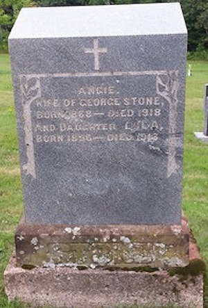 Birth Born on November 24, 1868 in Chatham, Northumberland Co., NB Death Died on November 11, 1918 in Oxford, Cumberland Co., NS Buried in Saint Cornelius Roman Catholic Cemetery in Streets Ridge, Cumberland Co., NS Marriages STONE, George B. Married on November 15, 1893 in Oxford Junction, Cumberland Co., NS Children STONE, William G.: 1904 Notes Death: Carcinoma Sources Nova Scotia Deaths: Book 39 Pg. 275 #1081 Images Angela (McDonald) Stone