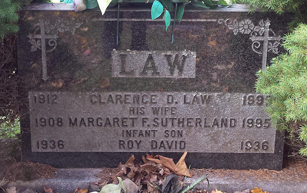 Parents Father: LAW, David Herbert Mother: WALTERS, Helen Claire Birth Born on April 24, 1912 in Urney, Kings Co., NB Death Died on January 09, 1999 in Mullins, Marion Co., SC Buried in Brookfield Westside Cemetery in Brookfield, Colchester Co., NS Marriages SUTHERLAND, Margaret Frances Married on June 06, 1934 in Brookfield, Colchester Co., NS Children LAW, Helen Audrey: March 28, 1935 - December 20, 1985 LAW, David Roy: March 12, 1936 - March 13, 1936 LAW, Kathleen A: May 03, 1937 LAW, Marian Elizabeth: February 01, 1940 - November 05, 2008 Notes Occupation: Farmer Images Clarence Law Birth Clarence & Margaret (Sutherland) & David Law Margaret Sutherland Marriage