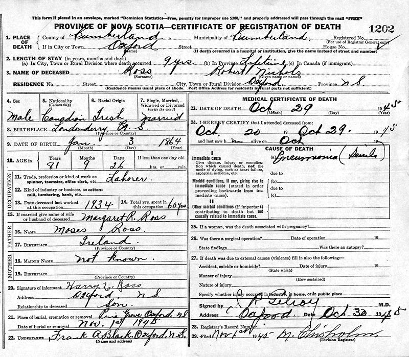 Birth Born on January 03, 1864 in Londonderry, Colchester Co., NS Death Died on October 29, 1945 in Oxford, Cumberland Co., NS Buried in Pine Grove Cemetery in Oxford, Cumberland Co., NS Marriages RUSHTON, Margaret Rebecca Married on March 18, 1896 in Acadia Mines, Colchester Co., NS Children ROSS, Harry Lester: May 24, 1906 - May 21, 1970 Notes Occupation: Miner Death: Pneumonia Sources Nova Scotia Deaths: Book 213 Pg. 1202 Images Robert Ross Death Robert Ross Marriage