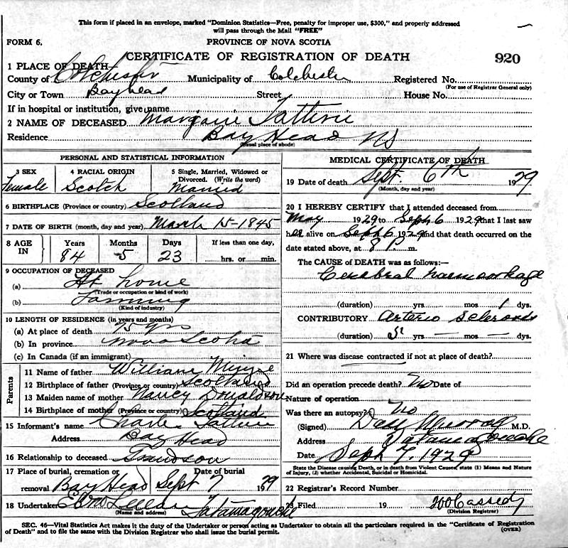 Birth Born on March 15, 1845 in Scotland Death Died on September 06, 1929 in Bayhead, Colchester Co., NS Buried in Union Church Cemetery in Bayhead, Colchester Co., NS Marriages TATTRIE, George Married on December 25, 1871 in Tatamagouche, Colchester Co., NS Children TATTRIE, Lawrence Stanton Daye: March 28, 1887 - December 15, 1940 Notes Death: Cerebral Hemorhage Sources Nova Scotia Deaths: Book 119 Pg. 920 Images Marjorie (Menzie) Tattrie Death George Tattrie Marriage