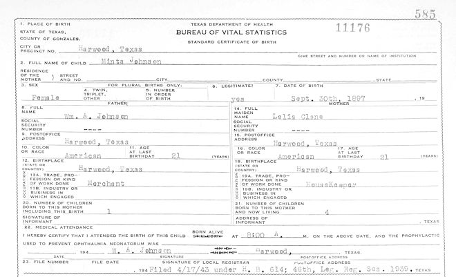 Birth Born on September 30, 1897 in Harwood, Gonzales Co., TX Death Died on August 01, 1982 in Tucson, Pima Co., AZ Buried in Evergreen Memorial Park in Tucson, Pima Co., AZ Marriages MANNING, Walter Edwin Married on June 08, 1917 in Gonzales, Gonzales Co., TX Children MANNING, Robert Edwin: July 01, 1922 - June 22, 1944 Sources Cemetery: Evergreen Memorial Park Tucson,AZ Cemetery: Evergreen Memorial Park Tucson,AZ Block 18 Images Minta Johnson Birth Minta (Johnson) Manning Walter E. Manning Marriage