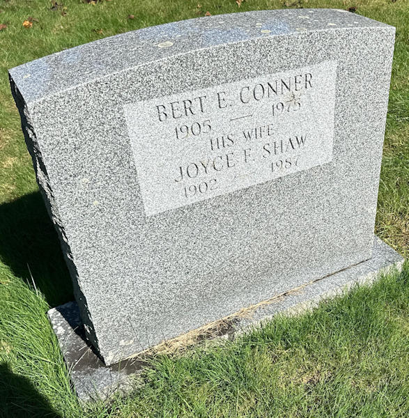 Parents Father: SHAW, John Leander Mother: YOUNG, Mary Matilda Birth Born on October 12, 1902 in Berwick, Kings Co., NS Death Died on July 07, 1987 in Framingham, Middlesex Co., MA Buried in Dell Park Cemetery in Natick, Middlesex Co., MA Marriages CONNER, Bert E. Married on 1928 in Framingham, Middlesex Co., MA Children CONNER, Bert E.: July 01, 1935 Notes Occupation: Clerk Sources Massachusetts Deaths: #038277 Images Bert & Joyce (Shaw) Conner