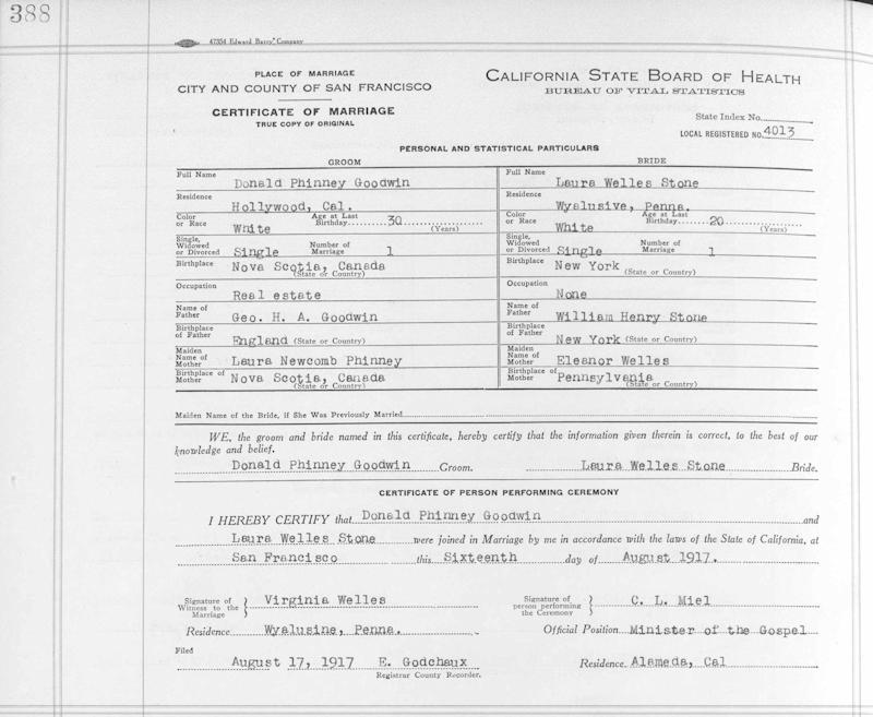 Parents Father: GOODWIN, George Henry Arnold Mother: PHINNEY, Laura Newcomb Birth Born on November 24, 1886 in Nova Scotia, Canada Death Died on October 19, 1978 in Los Angeles, Los Angeles Co., CA Marriages BISSANTZ, Mary Elizabeth (Mathewson) Married on September 13, 1948 in Hollywood, Los Angeles Co., CA STONE, Laura Welles Married on August 16, 1917 in San Francisco, San Francisco Co., CA Children GOODWIN, Paul Stone: 1920 GOODWIN, James A.: November 11, 1922 Sources California Deaths: SSN 564541729 Images Donald Goodwin Marriage Donald Goodwin Marriage