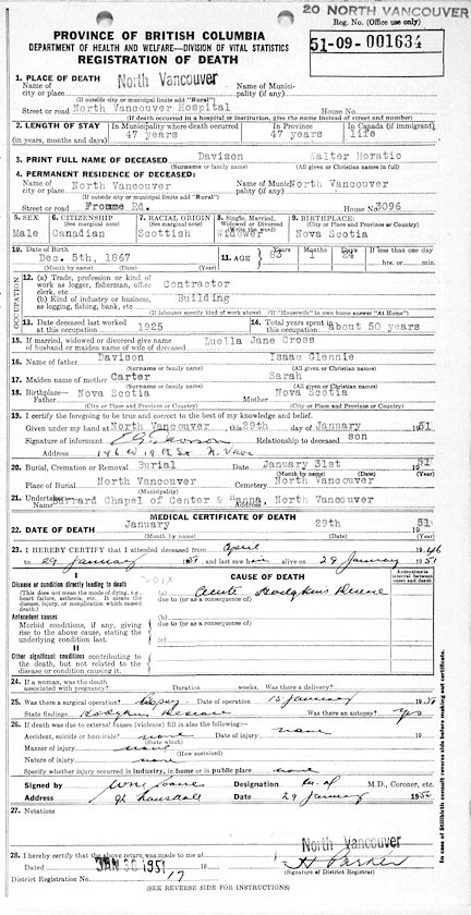Parents Father: DAVISON, Isaac Glennie Mother: CARTER, Sarah Weatherbee Birth Born on December 05, 1867 in River Philip, Cumberland Co., NS Death Died on January 29, 1951 in North Vancouver, Metro Vancouver Region, BC Buried in North Vancouver Cemetery in North Vancouver, Metro Vancouver Region, BC Marriages CROSS, Luella Jane Married on June 03, 1903 in Williamstown, Orange Co., VT Children DAVISON, Eldon Gregory: June 29, 1907 - September 20, 1966 Notes Occupation: Engineer/ Contractor Death: Acute Hodgkins Disease Sources BC Deaths: 1951-09-001634 Images Walter Davison Death Walter Davison Marriage