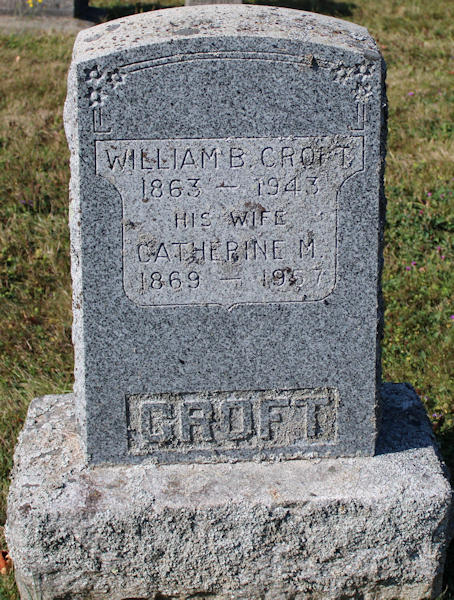 Birth Born on September 12, 1864 in Chester, Lunenburg Co., NS Death Died on January 06, 1943 in Upper Falmouth, Hants Co., NS Buried in St. George's Anglican Church Cemetery in Upper Falmouth, Hants Co., NS Marriages SANGSTER, Catherine Margaret Married on June 10, 1891 in Falmouth, Hants Co., NS Children CROFT, James Whitman: April 13, 1892 - October 13, 1962 CROFT, Maude Alice: January 10, 1895 - November 03, 1932 Notes Occupation: Wheelwright/ Carpenter Death: Carcinoma Ventriculs Sources Nova Scotia Deaths: Book 206 Pg. 237 Images William & Catherine (Sangster) Croft William Croft Death William Croft Marriage