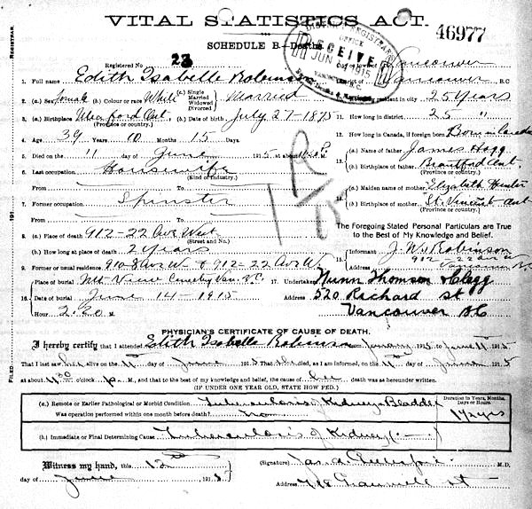 Birth Born on July 27, 1875 in Meaford, Grey Co., ON Death Died on June 11, 1915 in Vancouver, Metro Vancouver Region, BC Buried in Mountain View Cemetery in Vancouver, Metro Vancouver Region, BC Marriages ROBINSON, Algernon Perkins Married on May 03, 1893 in Newport, Brant Co., ON Children ROBINSON, Hubert Lindors: January 17, 1899 - December 30, 1962 Notes Death: Tuberculosis of Kidney & Bladder Sources BC Deaths: #46977 Images Edith Hoggan Death