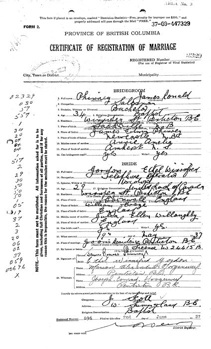 Parents Father: CRAZE, William Mother: WILLOUGHBY, Julia Ellen Birth Born on July 24, 1908 in Redruth, Cornwall, England Death Died on September 24, 1986 in Penticton, Okanagan-Similkameen Region, BC Buried in Cremation Marriages PHINNEY, James Ronald Married on May 19, 1937 in Penticton, Okanagan-Similkameen Region, BC Children PHINNEY, Patrick Gordon: December 17, 1946 - April 21, 2009 Notes Death: Cerebral Vascular Accident Occupation: Telephone Operator Sources BC Deaths: #86-09-015646 CN 015646 Images Ethel (Craze) Phinney Death James R. Phinney Marriage