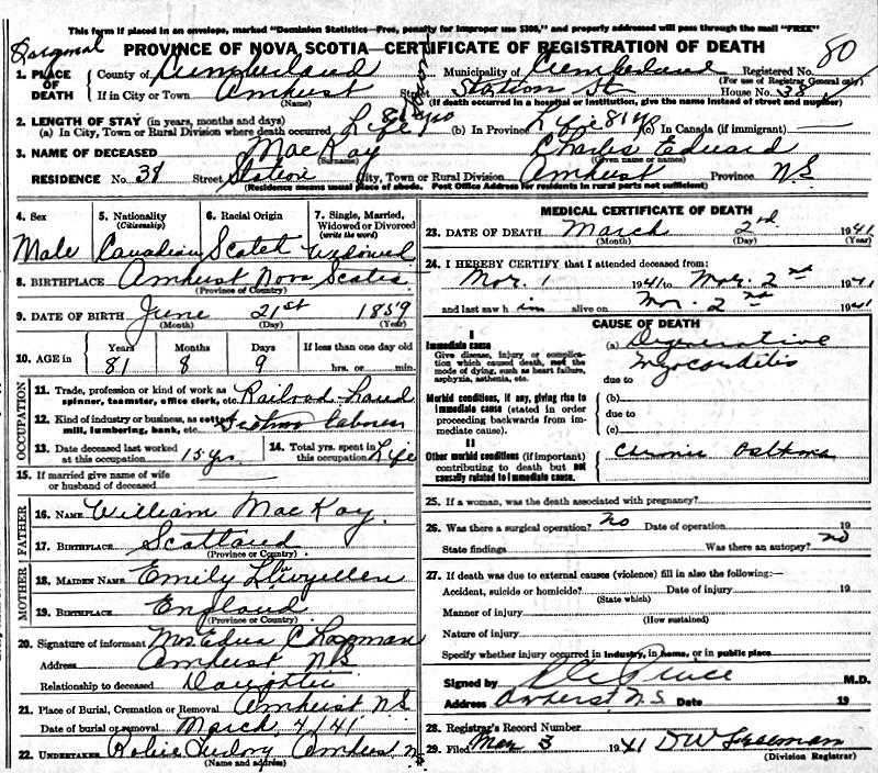 Birth Born on June 21, 1859 in Amherst, Cumberland Co., NS Death Died on March 02, 1941 in Amherst, Cumberland Co., NS Buried in Amherst, Cumberland Co., NS Marriages WEEKS, Bertha S. Married on August 21, 1883 in Amherst, Cumberland Co., NS Children McKAY, Mary Elizabeth: July 20, 1884 - August 04, 1923 Notes Occupation: Railroad Section Man Death: Degenerative Myocarditis Sources Nova Scotia Deaths: Book 199 Pg. 80 Images Charles McKay Death Charles McKay Marriage