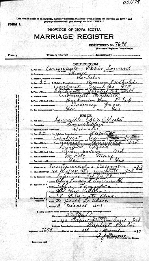 Parents Father: LANGILLE, Alfred William Mother: McKAY, Mary Elizabeth Birth Born on July 15, 1905 in Amherst, Cumberland Co., NS Death Died on May 04, 1974 in Amherst, Cumberland Co., NS Buried in Amherst Cemetery in Amherst, Cumberland Co., NS Marriages ARSENAULT, Blair Leonard Married on December 22, 1927 in Amherst, Cumberland Co., NS Notes Death: Myocardial Infarction Sources Nova Scotia Deaths: Year 1974 #4336 Images Effie (Langille) Arsenault Death Effie Langille Marriage