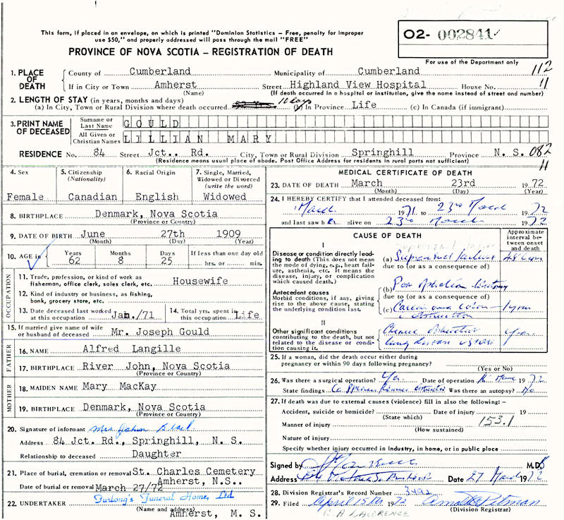 Parents Father: LANGILLE, Alfred William Mother: McKAY, Mary Elizabeth Birth Born on June 27, 1909 in Amherst, Cumberland Co., NS Death Died on March 23, 1972 in Amherst, Cumberland Co., NS Buried in St. Charles Cemetery in Amherst, Cumberland Co., NS Marriages GOULD, Joseph Roy Married on March 12, 1928 in Amherst, Cumberland Co., NS Children GOULD, Alfred R.: 1931 - 1967 Notes Death: Suprarenal Failure Sources Nova Scotia Deaths: Year 1972 #2841 Images Joseph R. & Lillian (Langille) & Alfred Gould Joseph R. & Lillian (Langille) Gould & Alfred Gould Lillian (Langille) Gould Death Lillian Langille Marriage