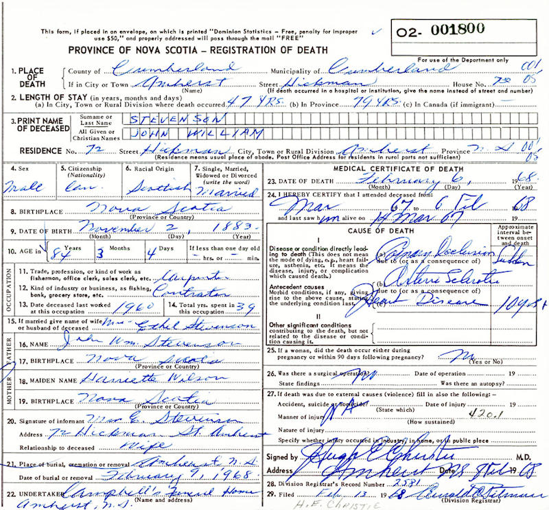 Birth Born on November 02, 1883 in Denmark, Colchester Co., NS Death Died on February 06, 1968 in Amherst, Cumberland Co., NS Buried in Amherst, Cumberland Co., NS Marriages LANGILLE, Edith Married on November 15, 1906 in River John, Pictou Co., NS Children STEVENSON, Marion June: 1907 STEVENSON, Mabel Edith: November 13, 1908 STEVENSON, Edna E.: May 13, 1910 - March 25, 1914 Notes Occupation: Farmer/ Carpenter Death: Coronary Occlusion Sources Nova Scotia Deaths: Year 1968 #1800 Images John Stevenson Death Edith Langille Marriage