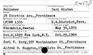 Birth Born on May 30, 1875 in Stockholm, Sweden Death Died on 1955 in Cranston, Providence Co., RI Buried in Saint Pauls Lutheran Church Cemetery in Warwick, Kent Co., RI Marriages LARSSON, Matilda Children SELINDER, Per Carl Albert: August 30, 1904 - January 28, 1977 Notes Occupation: Engraver Sources Findagrave.com: http://www.findagrave.com/cgi-bin/fg.cgi?page=gr&GSln=Selinder&GSiman=1&GScid=430206&GRid=146834084& Images Carl S. Selinder 1935 RI Census Carl Selinder WW1 Draft Carl Selinder Naturalization