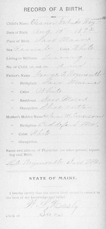 Birth Born on August 15, 1892 in Saco, York Co., ME Death Died on October 30, 1976 in Worcester, Worcester Co., MA Buried in Edgell Grove Cemetery and Mausoleum in Framingham, Middlesex Co., MA Marriages LIGHTBODY, Winfred Curran Married on September 18, 1915 in Berlin, Coos Co., NH Children LIGHTBODY, Martha A.: February 20, 1918 - January 22, 2001 LIGHTBODY, James Weymouth: August 03, 1924 - December 18, 2000 LIGHTBODY, George C.: July 27, 1926 - June 05, 2008 Sources Massachusetts Deaths: #046782 Images Eleanor Weymouth Birth James A. & Sarah (McLellan) Lightbody,Winfred & Lena (Weymouth) Lightbody,Charles & Elizabeth (Lightbody) Mayo,Bertha Lightbody Winfred Lightbody Marriage
