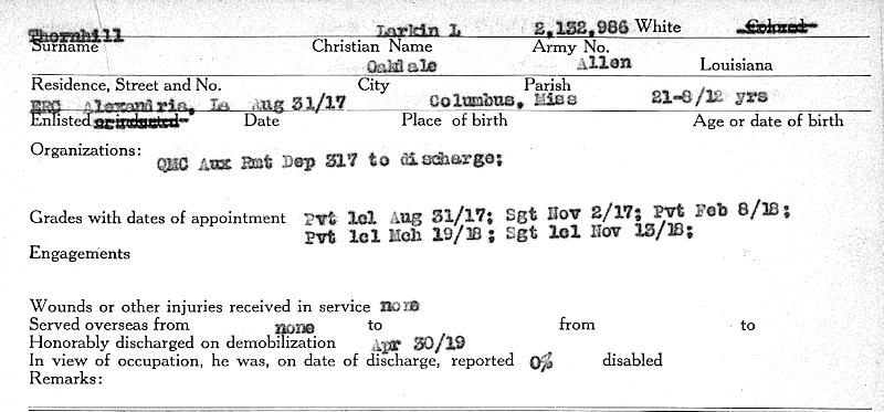 Birth Born on December 12, 1894 in Columbia, Marion Co., MS Death Died on January 06, 1985 in Little Rock, Pulaski Co., AR Buried in Pinecrest Memorial Park and Garden Mausoleum in Alexander, Saline Co., AR Marriages HILL, Ruth Gladys Children THORNHILL, Virginia Lou: November 05, 1930 - September 19, 2012 Notes Occupation: Merchant/ Employee US Treasury Department/ Chief Contract Officer US Veterns Admin Military Service: WW1 US Army Sergeant Sources US Social Security Index: SSN 432-76-3928 Findagrave.com: http://www.findagrave.com/cgi-bin/fg.cgi?page=gr&GRid=47106206 Cemetery: Pinecrest Memorial Park and Garden Mausoleum Alexander,AR Section 7 Images Larkin Thornhill Larkin Thornhill WW1 Draft Larkin Thornhill WW2 Draft Larkin Thornhill Military Discharge Larkin Thornhill Military Service