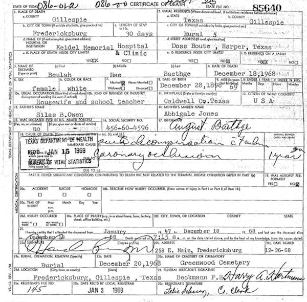 Birth Born on December 28, 1898 in Lockhart, Caldwell Co., TX Death Died on December 18, 1968 in Fredericksburg, Gillespie Co., TX Buried in Greenwood Cemetery in Fredericksburg, Gillespie Co., TX Marriages BAETHGE, August N. M. I. Married on January 11, 1931 in Gillespie Co., TX Children BAETHGE, Lennah Jo: June 27, 1939 - November 01, 2022 Notes Occupation: School Teacher Death: Acute Decompensation due to Coronary Occulusion Sources Texas Deaths: #85640 Images August & Beulah (Owen) Baethge Beulah (Owen) Baethge Death Beulah Owen