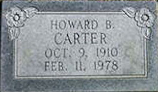 Birth Born on October 09, 1910 in Linden, Cass Co., TX Death Died on February 11, 1978 in Greenville, Hunt Co., TX Buried in Rosemound Cemetery in Commerce, Hunt Co., TX Marriages HOOPER, Minnie Eloise Children CARTER, Margaret Ann: February 01, 1934 - June 03, 1936 CARTER, Boy: August 14, 1938 - August 15, 1938 CARTER, James Roland: July 11, 1939 - April 06, 2014 CARTER, Mary Louise: February 25, 1943 CARTER, Howard B.: April 27, 1945 - April 27, 1945 CARTER, Juanita Lee Irene: July 31, 1946 Notes Occupation: Painter Death: Chronic Obstructive Lung Disease Sources Cemetery: Rosemound Cemetery Commerce,TX Lot 5, Block M Texas Deaths: #29669 Images Howard B. Carter Howard B. Carter Death