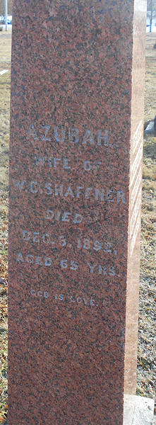 Parents Father: PHINNEY, Lawrence Willett Mother: BOWLBY, Sarah Birth Born on April 07, 1826 in Wilmot, Annapolis Co., NS Death Died on December 03, 1892 in Nictaux, Annapolis Co., NS Buried in Community Centre Cemetery in Nictaux, Annapolis Co., NS Marriages SHAFFNER, William Caleb Married on October 01, 1850 in Wilmot, Annapolis Co., NS Children SHAFFNER, Bernard Playfair: March 11, 1852 - July 28, 1878 SCHAFFNER, Frederick Laurence: August 18, 1854 - May 22, 1935 SHAFFNER, Charles Havelock: March 17, 1860 - February 20, 1940 SHAFFNER, Minnie Isabell: June 20, 1862 - May 31, 1941 SCHAFFNER, Arthur Steven Dewolfe: January 06, 1863 - August 03, 1936 SHAFFNER, Mildred V.: 1865 - November 24, 1883 SHAFFNER, Sidney Heber: June 27, 1868 - March 11, 1869 Sources Annapolis Cemetery Records: Nictaux Community Centre Cemetery #68 Images Azubah (Phinney) Shaffner