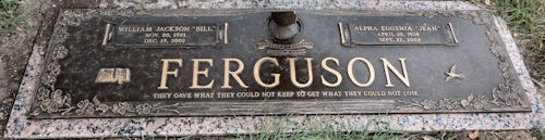 Birth Born on November 20, 1921 in Jacksboro, Jack Co., TX Death Died on December 15, 2002 in Early, Brown Co., TX Buried in Eastlawn Memorial Park in Early, Brown Co., TX Marriages KIRKPATRICK, Alpha Eugenia Married on April 10, 1951 in Revena, Fannin Co., TX Children FERGUSON, Deborah Renee: June 18, 1970 Notes Occupation: Welder - Ross Porta Plant/ Clergyman Military Service: US Navy WW2 Obituary: Rev. William "Bill" Ferguson, age 81, of Brownwood, died Sunday, Dec 15, 2002 at Brownwood Regional Medical Center. Visitation is scheduled for 6 to 8 pm Wednesday Dec. 18. Funeral services will be 2 pm Thursday, Dec. 19, 2002 at the Heartland Funeral Home in Early. Burial will follow in Eastlawn Memorial Park in Early, Texas. Rev. Ferguson was born in Jacksboro, Tex. on Nov. 20, 1921. He married Alpha "Jean" Kirkpatrick April 10, 1951 in Revena, Tex. She preceded him in death on Sept. 22, 2002 Rev. Ferguson served his country in the U.S. Navy and was a veteran of WWII. He worked for 17 years for Ross Porta Plant in Early as a welder and was the pastor for the Evangelical Free Church in Melvin, Tex. He also volunteered as a minister for the Brownwood State School, and received an award for volunteer of the year there. He had been a resident of Brownwood since 1963, moving there from Brady. He was a Baptist. Survivors include five sons; Jack Martin of Lewisville, Tex.; Larry Martin of Spring, Tex.; Daniel Ferguson and his wife Chrystal of league City, Tex.; David Ferguson and his wife Cynthia of Blanket; and Phillip Ferguson and his wife Sharon of May. Six daughters also survive, including; Mary Mason of Minnesota; Elizabeth Watson and husband Roy, of Lometa; Ruth Thompson and husband, Coy of Blanket; Becky Dudley and husband Thomas of Blanket; Lydia Barron and husband Robert of Blanket; Deborah Andrews and husband Clayton of Blanket. Thirty grandchildren and 22 great grandchildren also survive. He was preceded in death by his first wife Oma Jean Martin Ferguson; his second wife, Alpha "Jean" Ferguson; his parents Jess and Jesse Strange; and one brother, Floyd Ferguson. Sources US Social Security Index: SSN 459-18-8312 Images William & Alpha (Kirkpatrick) Ferguson William Ferguson