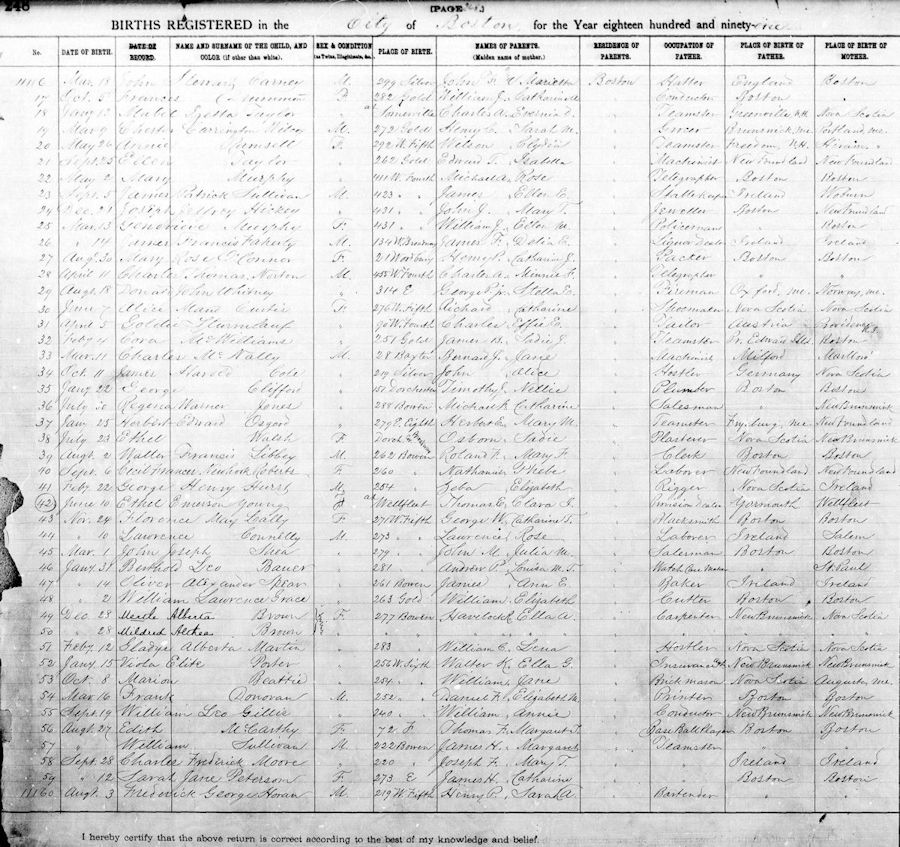 Parents Father: BROWN, Havelock Robert Mother: RATHBURN, Ella Armina Birth Born on December 28, 1891 in Boston, Suffolk Co., MA Death Died on 1960 in Boston, Suffolk Co., MA Buried in Saint Joseph Cemetery in West Roxbury, Suffolk Co., MA Marriages RYAN, Richard Joseph Married on June 08, 1910 in Boston, Suffolk Co., MA Children RYAN, Jeanne A.: March 31, 1917 - January 24, 1976 RYAN, Arline: 1922 Notes Occupation: Waitress Sources Findagrave.com: https://www.findagrave.com/memorial/189759394/myrtle-ryan Images Myrtle Brown Birth Myrtle Brown Marriage