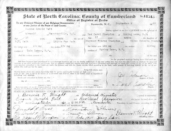 Birth Born on November 22, 1941 in Manchester, Cumberland Co., NC Marriages CHAMPION, Rae Carol Married on September 15, 1960 in Manchester, Cumberland Co., NC Children PAIT, Benjamin Monroe: March 15, 1963 PAIT, Teresa Roberta: March 17, 1965 PAIT, Eugene Arnold: November 22, 1971 Images Rae Champion Marriage