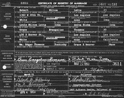 Parents Father: THOMSON, William Edgar Mother: WEAVER, Grace Evangeline Birth Born on July 10, 1929 in Los Angeles, Los Angeles Co., CA Marriages LATTA, Robert Milton Married on March 31, 1950 in Hollywood, Los Angeles Co., CA Images Grace Thomson Marriage