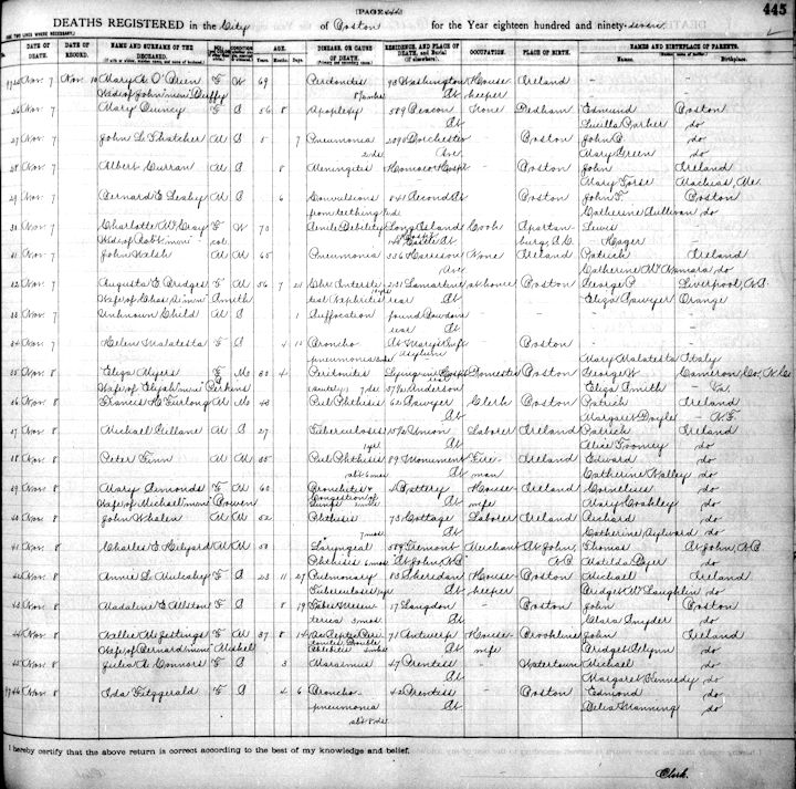 Birth Born on February 25, 1860 in Brookline, Norfolk Co., MA Death Died on November 08, 1897 in Boston, Suffolk Co., MA Marriages JESTINGS, Clifford Bernard Married on April 02, 1888 in Brookline, Norfolk Co., MA Children JESTINGS, Mary Frances: January 15, 1891 - 1969 JESTINGS, Charles Bernard: June 10, 1892 JESTINGS, Girl: May 06, 1894 - May 06, 1894 JESTINGS, Helen Minnettie: December 30, 1895 - March 14, 1896 JESTINGS, Ruth Clara: November 12, 1897 - 1920 Notes Death: Acute Septic Peritonitis/ Double Phlebitis Sources Massachusetts Deaths: Boston,Ma Pg. 445 #44 CN 9744 Images Ellen (Miskell) Jestings Death Bernard Jestings Marriage