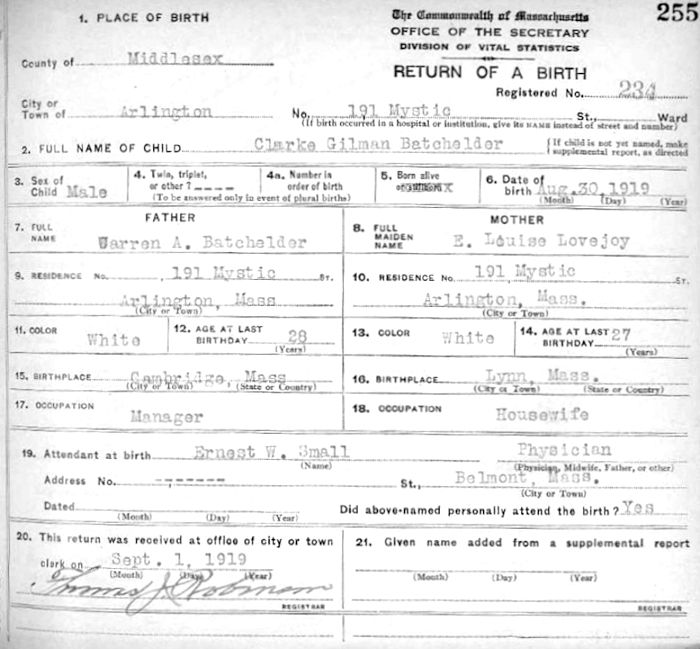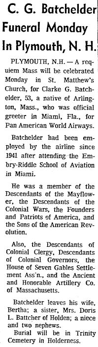 Parents Father: BATCHELDER, Warren Albert Mother: LOVEJOY, Emma Louise Birth Born on August 30, 1919 in Arlington, Middlesex Co., MA Death Died on November 14, 1972 in Miami-Dade Co., FL Buried in Trinity Churchyard Cemetery in Holderness, Grafton Co., NH Marriages BEQUIS, Bertha Dolores Married on February 24, 1971 in Miami-Dade Co., FL FLANNERY, Lea-Nora (Bayes) Married on September 20, 1943 in Miami-Dade Co., FL Divorced in 1944 Notes Occupation: Traffic Clerk - Travel Reservations - Miami Airport Greeter Pan Am Airways Sources Florida Deaths: #72138 Images Warren Batchelder Birth Clarke Batchelder William & Anna (Lawrence) & Blanche,Clark, Warren & Clarke Batchelder Clarke Batchelder Divorce Clarke Batchelder Marriage Clarke Batchelder Story Boston Herald 1972-11-17 Clarke Batchelder Obit Boston Herald 1972-11-17