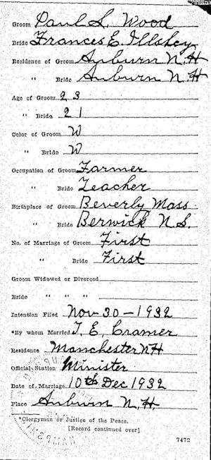 Parents Father: ILLSLEY, Isaac Loomer Mother: FREEMAN, Annie Manning Birth Born on July 16, 1911 in Berwick, Kings Co., NS Death Died on October 06, 2006 in Fremont, Rockingham Co., NH Buried in Auburn Village Cemetery in Auburn, Rockingham Co., NH Marriages WOOD, Paul Sawyer Married on December 10, 1932 in Auburn, Rockingham Co., NH Children WOOD, Elizabeth Jean: December 19, 1933 WOOD, Allan Illsley: April 08, 1936 - January 22, 1956 WOOD, Stanley Paul: July 07, 1937 WOOD, William H.: October 12, 1947 Notes Occupation: Teacher/ Tax Collector Obituary: AUBURN -- Frances I. Wood, 95, died Oct. 6, 2006, in Colonial Poplin Nursing Home, Fremont. Mrs. Wood was born in Berwick, Nova Scotia, Canada, on July 16, 1911, a daughter of Isaac and Annie (Freeman) Illsley. She was a resident of Auburn for most of her life. Mrs. Wood was a graduate of Pinkerton Academy, class of 1929, and a graduate of Plymouth Normal School, class of 1931. She taught in Bunker Hill School, a one-room schoolhouse in Auburn. She was a tax collector for Auburn for more than 10 years during the 1950s and into the 1960s. She had also worked for Gulton Industries in Manchester as an electronics assembler. Mrs. Wood was a member of the Longmeadow Congregational Church, Auburn. She is survived by two sons, William Wood of Auburn, and Stanley Wood of Auburn; a daughter, Elizabeth Tolbert of Stow, Mass.; six grandchildren; and four great-grandchildren. She was predeceased by her husband, Paul S. Wood, in 1999, and a son, Allan in 1956. She was also predeceased by her brother, Charles Illsley. Visiting hours will be held from 6 to 8 p.m. on Monday in the Peabody Funeral Homes and Crematorium, 15 Birch St., Derry. Funeral services will be held on Tuesday at 2 p.m.in the Longmeadow Congregational Church, 4 Wilsons Crossing Road, Auburn. Burial will follow in the Village Cemetery in Auburn. In lieu of flowers, donations may be made to Longmeadow Congregational Church, 4 Wilsons Crossing Road, Auburn, NH 03032. For more information, go to www.peabodyfuneralhome.com New Hampshire Sunday News Manchester,NH October 8, 2006 Images Frances Illsley Birth Allan,Thomas,Paul & Frances (Illsley) Wood Frances Illsley Marriage