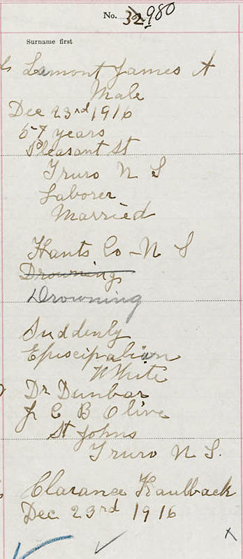 Birth Born on 1859 in Hants Co., NS Death Died on December 23, 1916 in Truro, Colchester Co., NS Buried in Truro, Colchester Co., NS Marriages RUSHTON, Dorothy Bell Children LAMONT, Richard Douglas: December 16, 1900 Notes Death: Drowning Sources Nova Scotia Deaths: Book 31 Pg. 298 #980 Images James Lamont Death