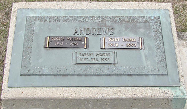 Birth Born on August 08, 1912 in Alberta, Canada Death Died on June 09, 1992 in Red Deer, Red Deer Co., AB Buried in Queen's Park Cemetery and Mausoleum in Calgary, Calgary Region, AB Marriages SMITH, Mary Isabel Children ANDREWS, Robert George: 1952 - 1952 Notes Occupation: Bank Teller Bank of Montreal Sources Mormons: https://www.familysearch.org/en/tree/person/details/G2MG-1YY Images George & Mary (Smith) & Robert Andrews