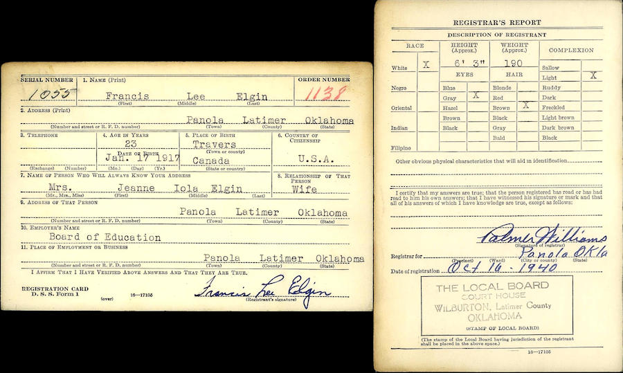 Birth Born on January 17, 1917 in Travers, Vulcan Co., AB Death Died on December 21, 2001 Buried in Chelsea Cemetery in Chelsea, Rogers Co., OK Marriages EGGENBERGER, Jeannette Lola Married on August 14, 1940 in Brooks, Newell Co., AB Children ELGIN, Douglas L.: 1942 ELGIN, Patricia J.: 1944 ELGIN, Donald M.: 1948 Notes Occupation: Teacher Sources Cemetery: Chelsea Cemetery Chelsea,OK Images Francis & Jeannette (Eggenberger) Elgin Francis Elgin WW2 Draft Francis Elgin