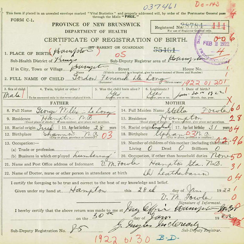 Parents Father: DELONG, George William Mother: FOWLER, Estella Josephine Birth Born on January 20, 1922 in Hampton, Kings Co., NB Death Died on September 03, 2007 in Sussex Corner, Kings Co., NB Buried in Pioneer Cemetery in Penobsquis, Kings Co., NB Marriages McQUINN, Muriel Pearl Married on June 05, 1948 in Penobsquis, Kings Co., NB Notes Occupation: Carpenter Sources Findagrave.com: https://www.findagrave.com/memorial/213898551/gordon-fenwick-delong Images Gordon Delong Birth Gordon & Muriel (McQuinn) DeLong Gordon Delong Marriage