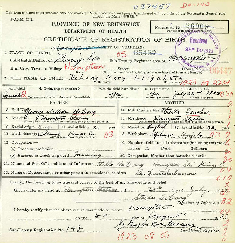 Parents Father: DELONG, George William Mother: FOWLER, Estella Josephine Birth Born on July 22, 1923 in Hampton, Kings Co., NB Death Died on August 19, 2019 in Moncton, Westmorland Co., NB Buried in Shannon Cemetery in Shannon, Queens Co., NB Marriages POWERS, Hanford Earl Married on August 24, 1946 in Penobsquis, Kings Co., NB Children POWERS, Donald Notes Occupation: Stenographer Obituary: The death of Mary Elizabeth Powers, 96, of Moncton, occurred on Monday, August 19, 2019. Mary was the second oldest of seven children and the only daughter of the late George and Estella (Fowler) DeLong of Penobsquis, NB. Mary is survived by her son, Donald, and his wife, Carmel (Power) of Dartmouth, NS; one grandson, Robb (Mary) Powers of Kingston Peninsula, NB; one granddaughter, Erin Hyland of Dartmouth; two great grandsons, Zerach Kearney of Kingston and Xavier Hyland of Dartmouth; and her youngest brother, David (Marilyn), of Medicine Hat, Alberta. She enjoyed special relationships with her nieces and nephews who will all treasure her memory and their time spent together. Besides her parents, Mary was predeceased by her husband, Hank in 1996, and by her brothers Bill (Red Deer, AB), Don (Penobsquis, NB), Gordon (Sussex, NB), Myles (St. Stephen, NB), and John (Halifax, NS). Sources Newspaper Obituary: Moncton,NB August 2019 Images Mary Delong Birth Mary E. Delong Marriage Mary Delong