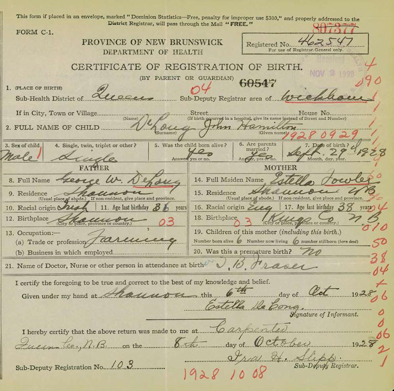 Parents Father: DELONG, George William Mother: FOWLER, Estella Josephine Birth Born on September 29, 1928 in Wickham, Queens Co., NB Death Died on 2012 in New Brunswick, Canada Buried in Shannon Cemetery in Shannon, Queens Co., NB Marriages , Helen Sources Findagrave.com: https://www.findagrave.com/memorial/236464486/john-hamilton-delong Images John Delong Birth