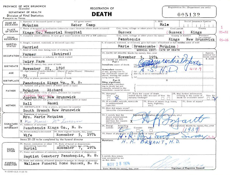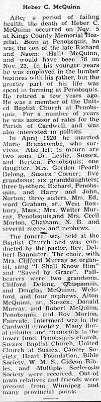 Birth Born on November 22, 1898 in Penobsquis, Kings Co., NB Death Died on November 05, 1974 in Sussex, Kings Co., NB Buried in Cardwell Baptist Cemetery in Penobsquis, Kings Co., NB Marriages BRANSCOMBE, Daisy Marie Married on April 29, 1920 in Cornhill, Kings Co., NB Children McQUINN, Muriel Pearl: March 20, 1924 - April 15, 2013 Notes Occupation: Lumberman/ Dairy Farmer Death: Myocardial Infarction Historical Information: Heber McQuinn passed his youth with all the hard work and plain living of the time, growing up in a lively family with 6 brothers and 3 sisters. He helped in the lumber woods as early as age 9, which is where his love for horses began. In 1918, aged 19, he went on a harvest excursion to Ardath, Saskatchewan with his older brother Warren. Two years later he married a young school teacher, Marie Branscombe. (Her father Abram had once caught Heber stealing his apples, for which he was on the receiving end of a well-aimed apple in the dark.) Marie and Heber had their children in Penobsquis, then lived in South Branch. Heber continued in the lumber business with his father, Richard, until life changed in 1932 when he bought the large dairy farm of Marie's parents and moved back to Penobsquis. Heber is remembered fondly for his outgoing nature and mischievous ways. Visits to the farm were fun even when piling wood or doing farm chores. Memories shared by Heber and Marie's family include sleigh rides (with warm buffalo style robes and bells ringing), fox farming, bee hives, alder whistles, and Heber's iconic straw hat. His nickname was Sam. He was well known for stories and recitations such as "The Hole in the Nickel" and tunes on his harmonica such as "Red Wing". There's a spot between Penobsquis and Sussex the oldtimers call Ghost Hollow. Apparently it was so named because the bones of a peddler who had lost his way were found there. Heber once rode past Ghost Hollow on his black horse, after a late night at the home of a lady he was courting. He looked to one side and saw the apparition of a headless man moving alongside him. He was so frightened, he raced home as fast as the horse could take him. He outdistanced his ghostly companion near Pioneer Cemetery, but never slowed down. When he got home the horse was in such a lather that Heber's mother, Naomi, always called it the night a black horse turned white. For a number of years Heber was assessor of rates for the Parish of Cardwell. He had a lively interest in politics. Heber was a member of the Cardwell Baptist Church, and was a man who cared about his God, family and community. In 1957 - 1958, after a fire destroyed the Penobsquis Baptist Church, he chaired the Cardwell Baptist Church committee that worked with the Penobsquis Baptist Church on the terms of their union into a single congregation. Heber and Marie were married 54 years when he passed away in 1974. Sources NB Deaths: #5132 Images Heber & Daisy (Branscombe) McQuinn Heber McQuinn Death Heber & Daisy (Branscombe) McQuinn 50th Anniversary Heber McQuinn Marriage Heber McQuinn Obit
