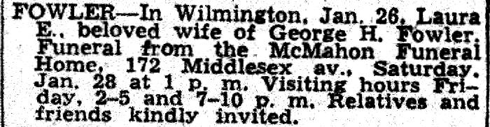 Parents Father: MACKINLEY, John H. Mother: FOSTER, Clarinda Augusta Birth Born on 1876 in New Brunswick, Canada Death Died on January 26, 1950 in Wilmington, Middlesex Co., MA Buried in Westlawn Cemetery in Littleton, Middlesex Co., MA Marriages FOWLER, George Henry Married on 1933 in Wilmington, Middlesex Co., MA FOWLER, Brunswick Glover Married on February 10, 1898 in Littleton, Middlesex Co., MA Sources Newspaper Obituary: The Boston Daily Globe Boston,MA Jan 27, 1950 Images Brunswick,Laura (MacKinley),George H. Fowler,Alice (MacKinley) & Rollin Benson Brunswick & Laura (MacKinley) Fowler Brunswick Fowler Marriage Laura (MacKinley) Fowler Obit The Boston Daily Globe Boston,MA Jan 27, 1950