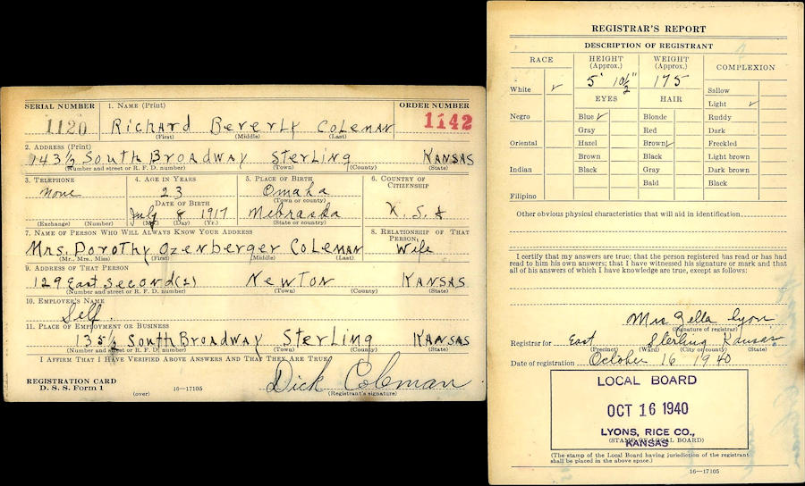 Parents Father: COLEMAN, Paul Mother: FENWICK, Margaret Hastings Birth Born on July 08, 1917 in Omaha, Douglas Co., NE Death Died on February 04, 1988 in Cochise, Cochise Co., AZ Marriages OZENBERGER, Dorothy L. Children COLEMAN, Leigh A.: 1945 Notes Occupation: Jeweller Military Service: WW2 US Army Images Richard Coleman WW2 Draft