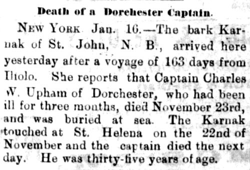 Birth Born on February 15, 1853 in Harvey, Albert Co., NB Death Died on November 23, 1887 in At Sea Buried in At Sea in Off The West Coast of Africa Marriages FOWLER, Eliza Married on November 12, 1881 in Boston, Suffolk Co., MA Children UPHAM, Winnifred Weldon: September 10, 1882 - December 28, 1953 Notes Occupation: Ship Captain Death: Malaria Obituary: The bark "Karnak" of St. John, N.B., arrived at New York, Saturday after a voyage of 163 days from Iloilo,Philippines. She reports that Capt. UPHAM of Dorchester (West. Co.) age 35, died Nov. 23rd. He was ill three months and buried at sea. Marriage Notice: m. Church of Evangel, Boston, 12th inst., by Rev. F.B. Allen, assistant Rector of Trinity, Capt. C.W. UPHAM, barque "Karnak" / Eliza FOWLER d/o Joseph A. FOWLER, all of Saint John. Sources Newspaper: The Daily Telegraph Saint John,NB January 17,1888 Images Eliza Fowler Marriage Charles Upham Obit The Moncton Transcript Moncton,NB Jan 16,1888