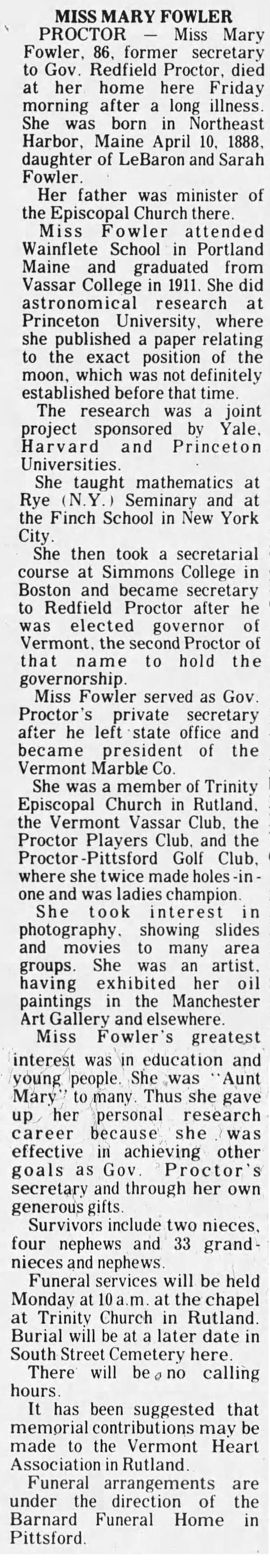 Parents Father: FOWLER, LeBaron Wilford Mother: FOWLER, Sarah Ann Birth Born on April 10, 1888 in Mount Desert, Hancock Co., ME Death Died on April 12, 1974 in Proctor, Rutland Co., VT Buried in South Street Cemetery in Proctor, Rutland Co., VT Notes Death: Congestive Heart Failure Occupation: Astronomical Research/ Math Teacher/ Secretary for Governor of Vermont/ Private Secretary President of Vermont Marble Co. Sources Vermont Deaths: #1220 Images Mary Fowler Border Crossing Mary E. Fowler Obit The Rutland Daily Herald Rutland,VT Apr 13,1974 Mary Fowler Mary Fowler Death Mary E. Fowler Obit The Rutland Daily Herald Rutland,VT Apr 13,1974
