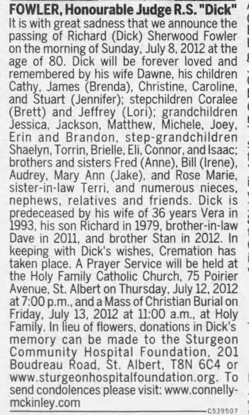 Parents Father: FOWLER, George Frederick Mother: GRAY, Adeline Alice (Kahandawes) Birth Born on April 12, 1932 in Alberta, Canada Death Died on July 08, 2012 in Saint-Albert, Edmonton Region, AB Buried in Saint Albert Roman Catholic Cemetery in Saint-Albert, Edmonton Region, AB Marriages BUSHKO, Vera , Dawne Children FOWLER, James FOWLER, Stuart FOWLER, Catherine FOWLER, Christine FOWLER, Caroline FOWLER, Richard Sherwood: February 28, 1959 - March 02, 1979 Notes Occupation: Lawyer/ Judge Sources Newspaper Obituary: Calgary Herald Calgary,AB July 10,2012 Images Ebenezer Bent Marriage & Ezra Bent Birth Richard S. & Vera (Bushko) Fowler Richard Fowler Obit Calgary Herald Calgary,AB July 10,2012