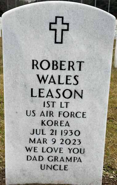 Birth Born on July 21, 1930 in Boston, Suffolk Co., MA Death Died on March 09, 2023 in Maine, USA Buried in Maine Veterans Memorial Cemetery in Augusta, Kennebec Co., ME Marriages WALKER, Barbara Mary Ann Married on December 31, 1955 Children LEASON, Steven Walker: September 01, 1958 LEASON, Cynthia C. A.: October 16, 1962 Notes Military Service: Korea USAF Radar Officer Lieutenant Sources Maine Cemeteries: Maine Veterans Memorial Cemetery Augusta,ME Images Robert Leason