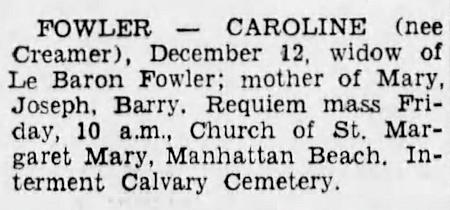 Birth Born on 1885 in New York, NY Death Died on December 12, 1939 in Brooklyn, Kings Co., NY Buried in Calvary Cemetery in Woodside, Queens Co., NY Marriages FOWLER, LeBaron Ellegood Children FOWLER, Mary Catherine: June 02, 1919 - February 11, 2007 FOWLER, Joseph Creamer: September 26, 1920 - May 18, 2003 FOWLER, Barry Andrew: November 02, 1924 - September 24, 1995 Sources Newspaper Obituary: Brooklyn Eagle Brooklyn,NY Dec 13,1939 Images Caroline (Creamer) Fowler Obit Brooklyn Eagle Brooklyn,NY Dec 13,1939