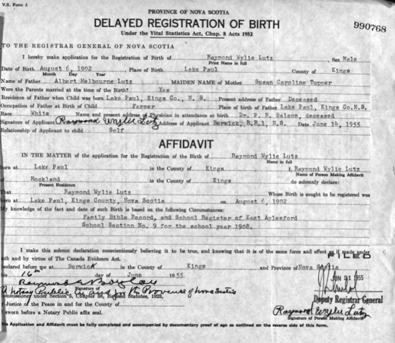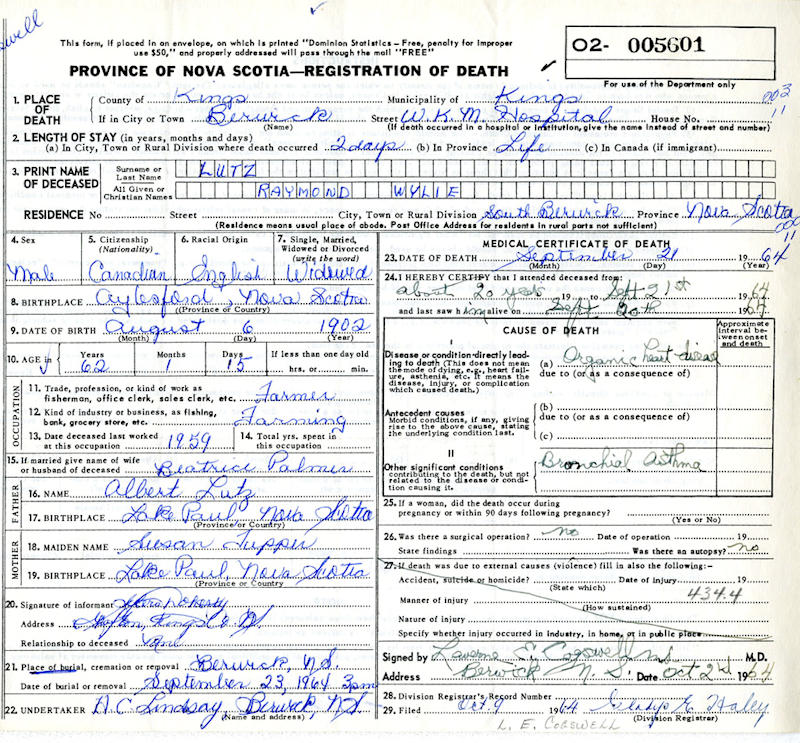 Birth Born on August 06, 1902 in Lake Paul, Kings Co., NS Death Died on September 21, 1964 in Berwick, Kings Co., NS Buried in Berwick Cemetery in Berwick, Kings Co., NS Marriages PALMER, Beatrice Viola Married on October 20, 1924 in Aylesford, Kings Co., NS Children LUTZ, Lorimer Lindsay: 1927 - May 15, 1998 LUTZ, Ray Hibbert: 1932 - December 08, 1999 Notes Occupation: Farmer Death: Organic Heart Disease Sources Nova Scotia Deaths: Year 1964 Pg. 5601 Images Raymond Lutz Birth Raymond Lutz Death Beatrice Palmer Marriage