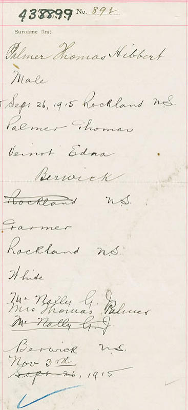 Parents Father: PALMER, Thomas Mother: VEINOT, Edna Birth Born on September 26, 1915 in Rockland, Kings Co., NS Death Died on December 19, 1927 in Berwick, Kings Co., NS Buried in Berwick Cemetery in Berwick, Kings Co., NS Notes Occupation: Diabetes Mellitis Sources Nova Scotia Deaths: Book 126 Pg. 307 Images Thomas H. Palmer Birth Thomas H. Palmer Death