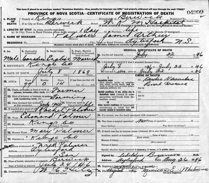 Parents Father: PALMER, Edmund Chute Mother: PALMER, Mary Eliza Birth Born on August 08, 1869 in South Mountain, Kings Co., NS Death Died on July 22, 1946 in Berwick, Kings Co., NS Buried in Berwick Cemetery in Berwick, Kings Co., NS Marriages BORDEN, Rachel Ann Married on January 13, 1892 in Kentville, Kings Co., NS Children PALMER, George E.: December 09, 1896 - October 31, 1931 PALMER, Greta Delia: March 16, 1898 - 1988 PALMER, Fred: February 16, 1900 PALMER, Alice Marie: April 23, 1904 - June 16, 1963 Notes Occupation: Farmer Death: Cardio Muscular Renal Disease Sources Nova Scotia Deaths: Year 1946 Pg. 4999 Images James Palmer Birth George Palmer,James & Rachel (Borden) Palmer James Palmer Death James Palmer Marriage