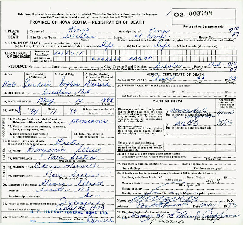 Birth Born on May 10, 1898 in Weston, Kings Co., NS Death Died on April 28, 1973 in Weston, Kings Co., NS Buried in Aylesford Union Cemetery in Aylesford, Kings Co., NS Marriages PALMER, Greta Delia Married on December 17, 1919 in Aylesford, Kings Co., NS Children ELLIOTT, George Benjamin: March 30, 1924 - July 16, 1996 ELLIOTT, Geraldine Maurie: 1935 - September 12, 2025 Notes Occupation: Farmer Death: Myocardial Infarction Sources Nova Scotia Deaths: Year 1973 #3798 Images Charles & Greta (Palmer) Elliott Charles Elliott Death Greta Palmer Marriage