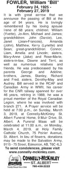 Parents Father: FOWLER, William Frederick Mother: BATESON, Irene Beatrice Marriages , Yvette Images William Fowler Obit Edmonton Journal Edmonton,AB March 2,2019